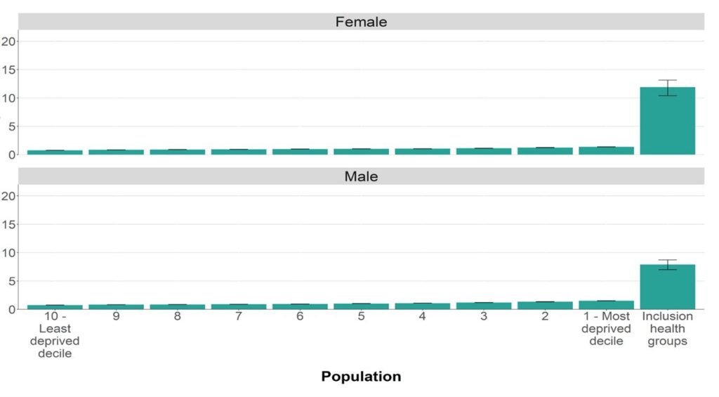 In a snapshot, this graph demonstrates the extent of health inequalities experienced by inclusion health groups, from least to most deprived: